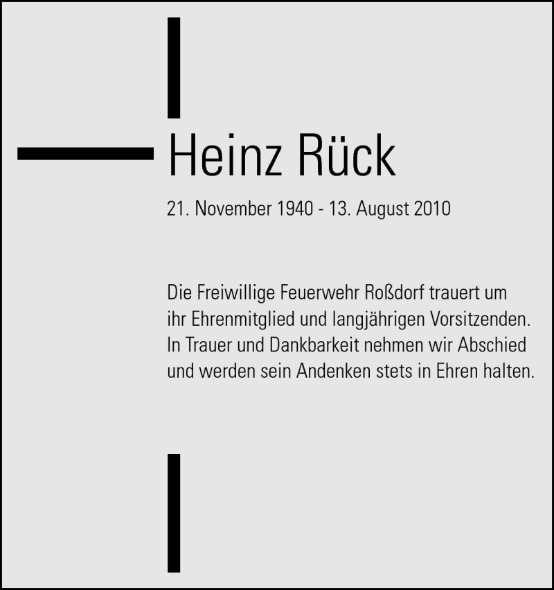 Hier finden Sie alle Traueranzeigen aus der Zeitung, die bisher für Heinz Rück erschienen sind. Weitere Traueranzeigen, die in der Zeitung erscheinen, werden hier ebenfalls aufgelistet