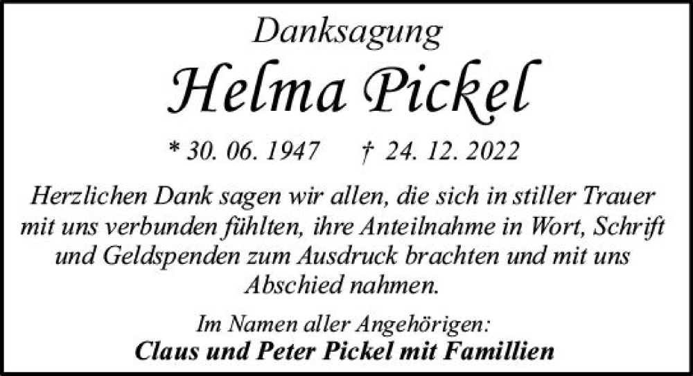 Hier finden Sie alle Traueranzeigen aus der Zeitung, die bisher für Helma Pickel erschienen sind. Weitere Traueranzeigen, die in der Zeitung erscheinen, werden hier ebenfalls aufgelistet