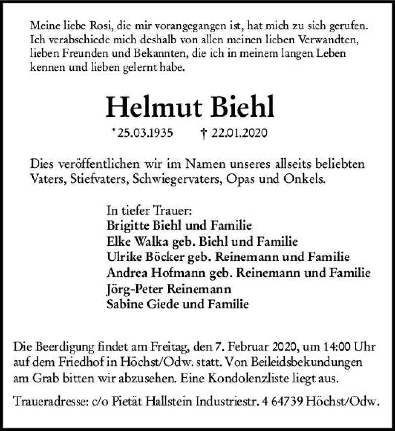 Hier finden Sie alle Traueranzeigen aus der Zeitung, die bisher für Helmut Biehl erschienen sind. Weitere Traueranzeigen, die in der Zeitung erscheinen, werden hier ebenfalls aufgelistet