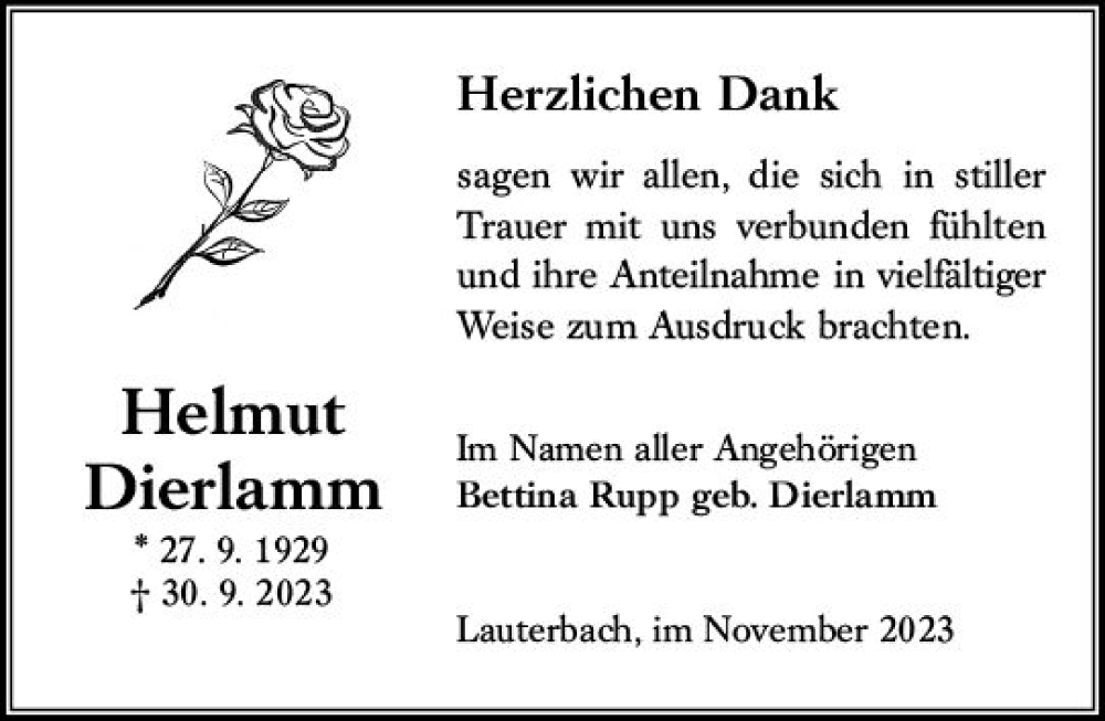 Hier finden Sie alle Traueranzeigen aus der Zeitung, die bisher für Helmut Dierlamm erschienen sind. Weitere Traueranzeigen, die in der Zeitung erscheinen, werden hier ebenfalls aufgelistet