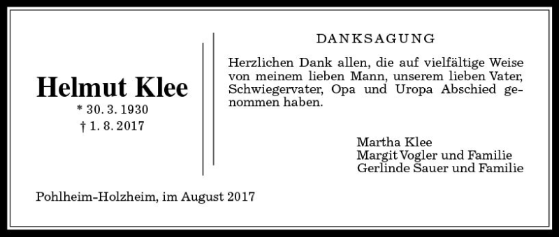 Hier finden Sie alle Traueranzeigen aus der Zeitung, die bisher für Helmut Klee erschienen sind. Weitere Traueranzeigen, die in der Zeitung erscheinen, werden hier ebenfalls aufgelistet