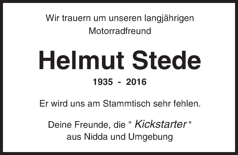 Hier finden Sie alle Traueranzeigen aus der Zeitung, die bisher für Helmut Stede erschienen sind. Weitere Traueranzeigen, die in der Zeitung erscheinen, werden hier ebenfalls aufgelistet
