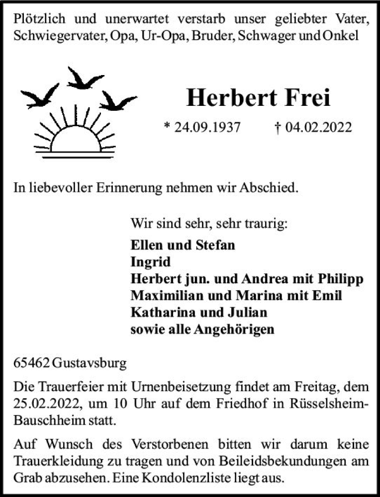 Hier finden Sie alle Traueranzeigen aus der Zeitung, die bisher für Herbert Frei erschienen sind. Weitere Traueranzeigen, die in der Zeitung erscheinen, werden hier ebenfalls aufgelistet