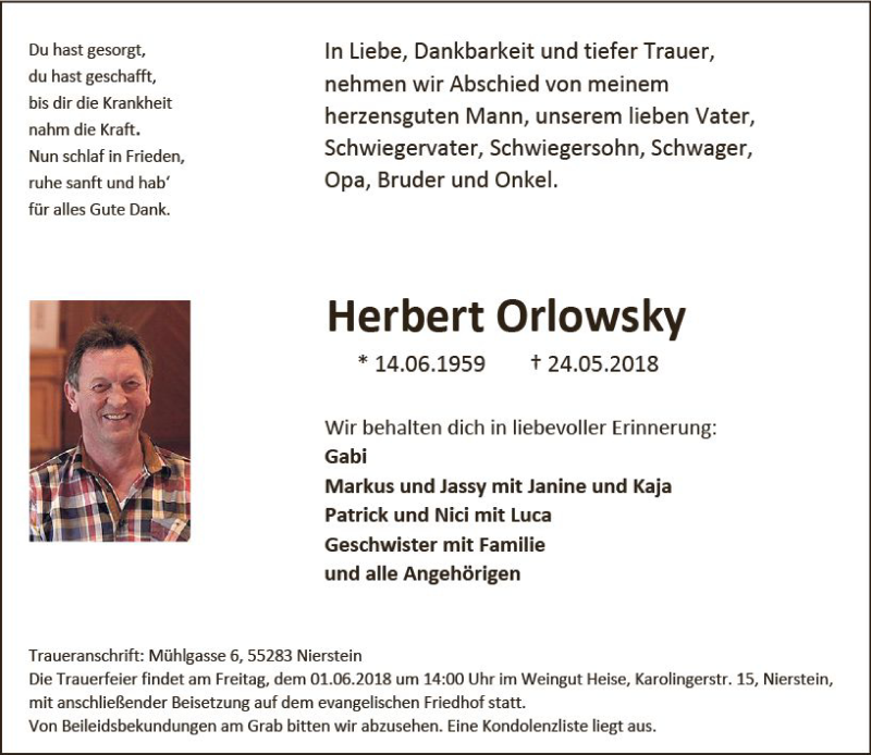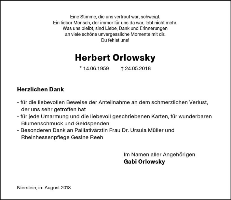 Hier finden Sie alle Traueranzeigen aus der Zeitung, die bisher für Herbert Orlowsky erschienen sind. Weitere Traueranzeigen, die in der Zeitung erscheinen, werden hier ebenfalls aufgelistet
