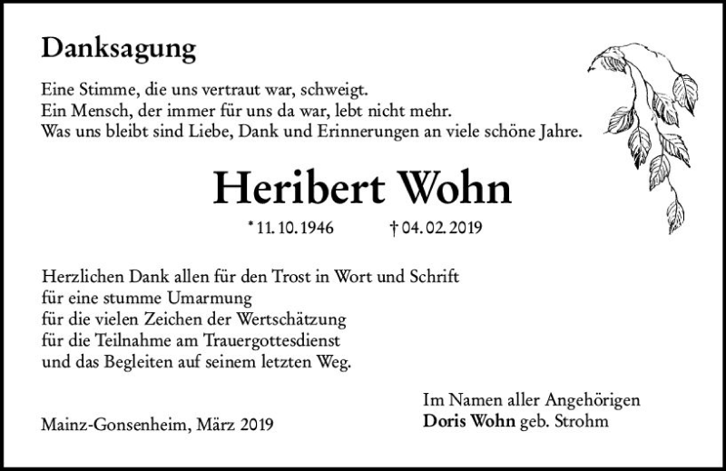 Hier finden Sie alle Traueranzeigen aus der Zeitung, die bisher für Heribert Wohn erschienen sind. Weitere Traueranzeigen, die in der Zeitung erscheinen, werden hier ebenfalls aufgelistet