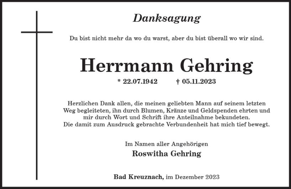 Hier finden Sie alle Traueranzeigen aus der Zeitung, die bisher für Herrmann Gehring erschienen sind. Weitere Traueranzeigen, die in der Zeitung erscheinen, werden hier ebenfalls aufgelistet