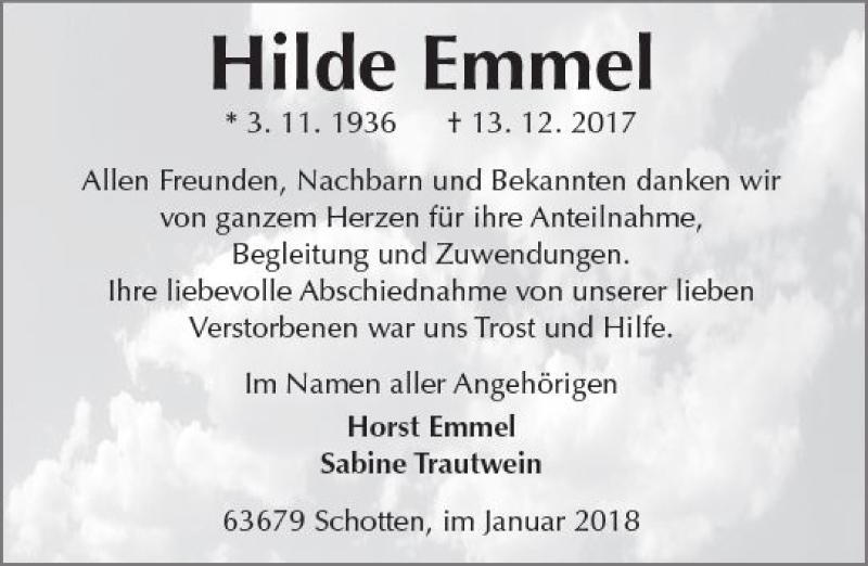 Hier finden Sie alle Traueranzeigen aus der Zeitung, die bisher für Hilde Emmel erschienen sind. Weitere Traueranzeigen, die in der Zeitung erscheinen, werden hier ebenfalls aufgelistet