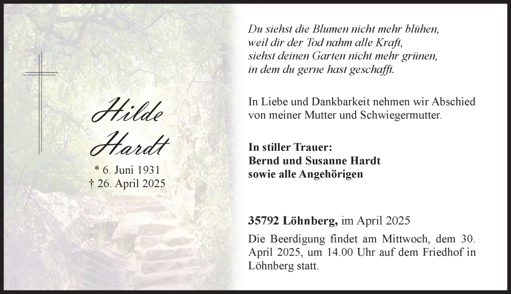 Hier finden Sie alle Traueranzeigen aus der Zeitung, die bisher für Hilde Hardt erschienen sind. Weitere Traueranzeigen, die in der Zeitung erscheinen, werden hier ebenfalls aufgelistet