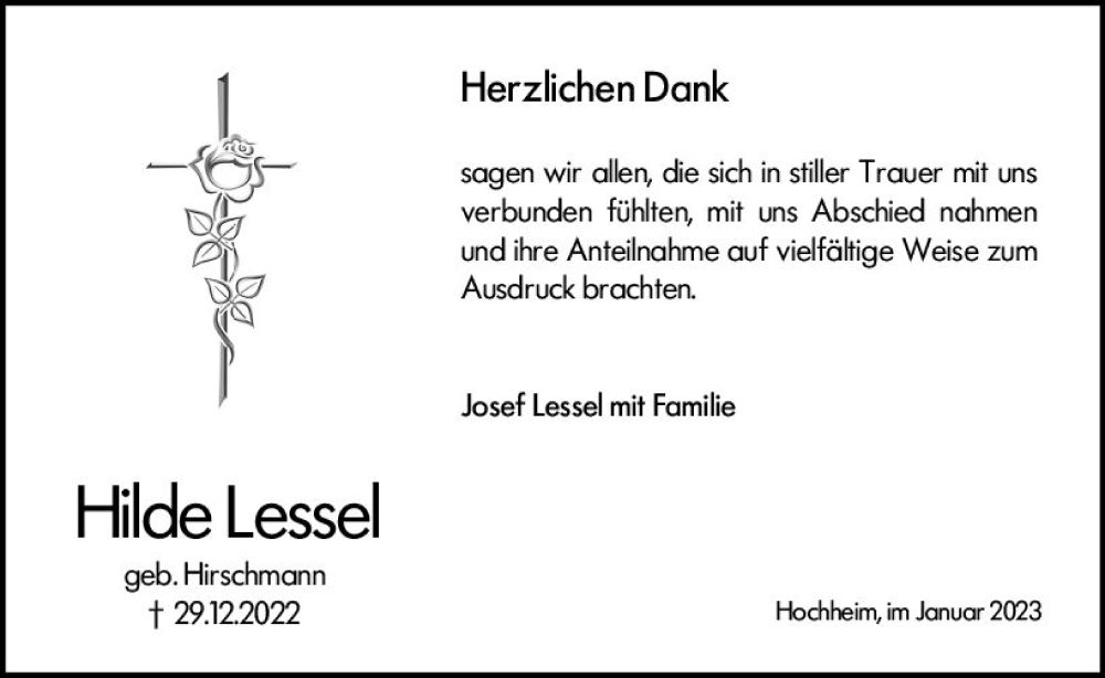 Hier finden Sie alle Traueranzeigen aus der Zeitung, die bisher für Hilde Lessel erschienen sind. Weitere Traueranzeigen, die in der Zeitung erscheinen, werden hier ebenfalls aufgelistet