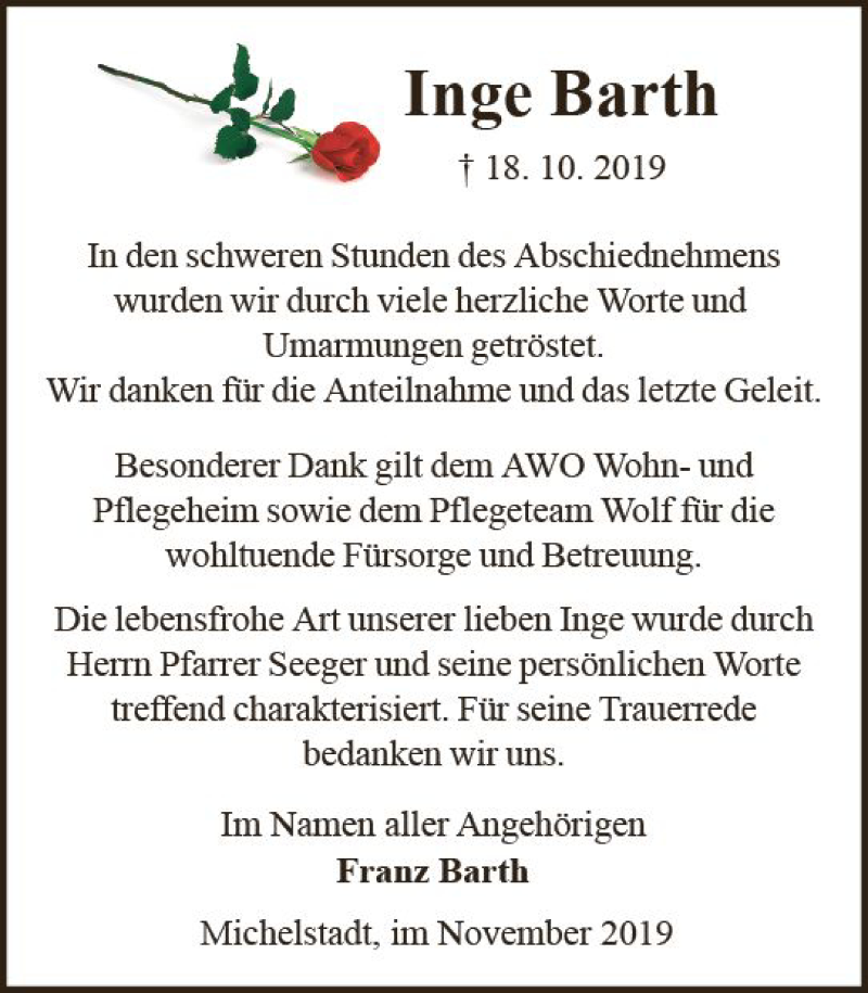 Hier finden Sie alle Traueranzeigen aus der Zeitung, die bisher für Inge Barth erschienen sind. Weitere Traueranzeigen, die in der Zeitung erscheinen, werden hier ebenfalls aufgelistet