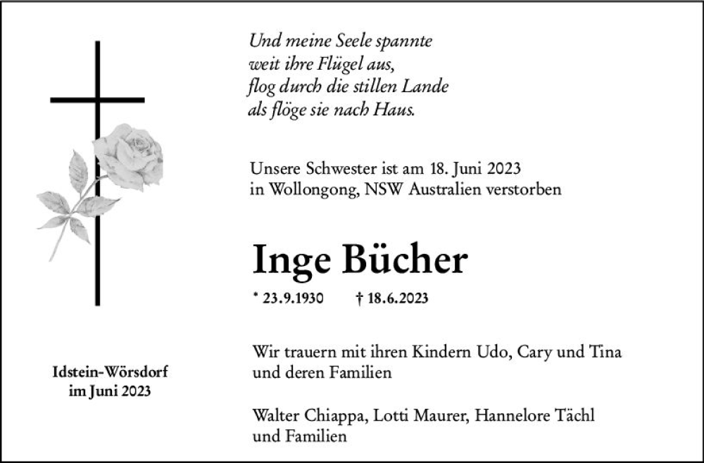 Hier finden Sie alle Traueranzeigen aus der Zeitung, die bisher für Inge Bücher erschienen sind. Weitere Traueranzeigen, die in der Zeitung erscheinen, werden hier ebenfalls aufgelistet