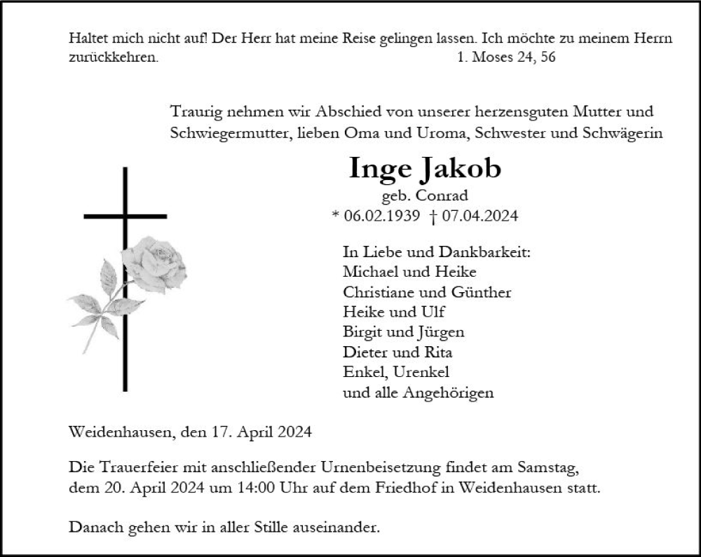 Hier finden Sie alle Traueranzeigen aus der Zeitung, die bisher für Inge Jakob erschienen sind. Weitere Traueranzeigen, die in der Zeitung erscheinen, werden hier ebenfalls aufgelistet