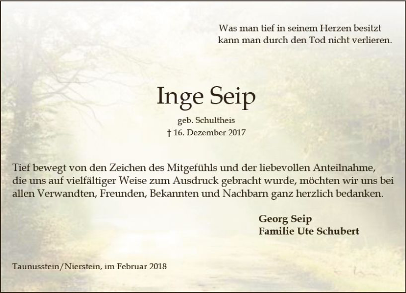 Hier finden Sie alle Traueranzeigen aus der Zeitung, die bisher für Inge Seip erschienen sind. Weitere Traueranzeigen, die in der Zeitung erscheinen, werden hier ebenfalls aufgelistet