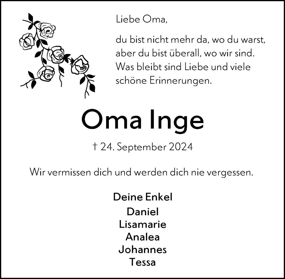 Hier finden Sie alle Traueranzeigen aus der Zeitung, die bisher für Inge Wetter erschienen sind. Weitere Traueranzeigen, die in der Zeitung erscheinen, werden hier ebenfalls aufgelistet
