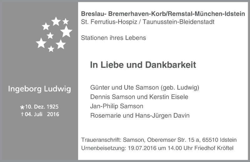 Hier finden Sie alle Traueranzeigen aus der Zeitung, die bisher für Ingeborg Ludwig erschienen sind. Weitere Traueranzeigen, die in der Zeitung erscheinen, werden hier ebenfalls aufgelistet
