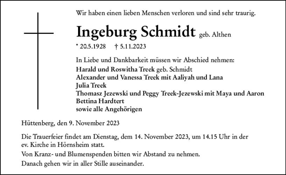 Hier finden Sie alle Traueranzeigen aus der Zeitung, die bisher für Ingeburg Schmidt erschienen sind. Weitere Traueranzeigen, die in der Zeitung erscheinen, werden hier ebenfalls aufgelistet