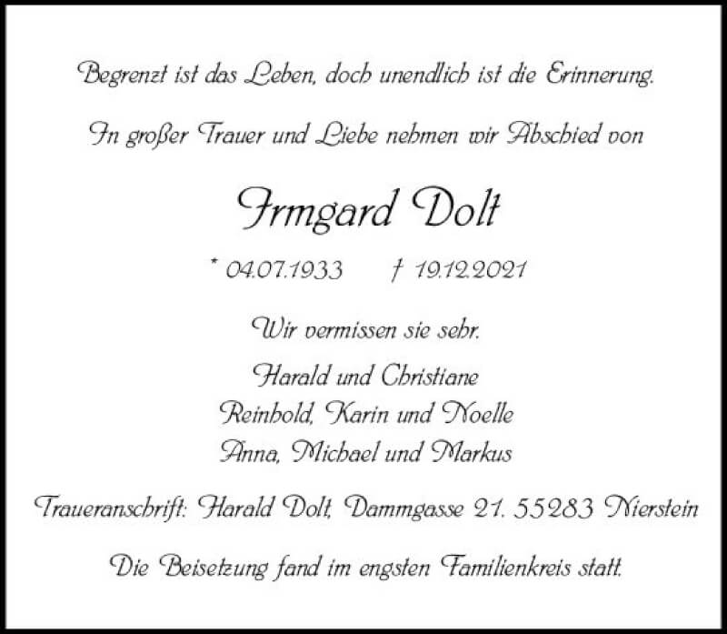 Hier finden Sie alle Traueranzeigen aus der Zeitung, die bisher für Irmgard Dolt erschienen sind. Weitere Traueranzeigen, die in der Zeitung erscheinen, werden hier ebenfalls aufgelistet