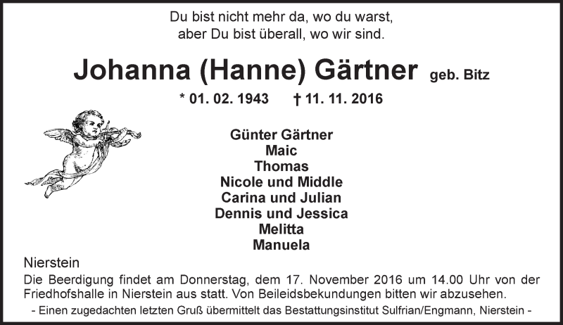 Hier finden Sie alle Traueranzeigen aus der Zeitung, die bisher für Johanana Gärtner erschienen sind. Weitere Traueranzeigen, die in der Zeitung erscheinen, werden hier ebenfalls aufgelistet