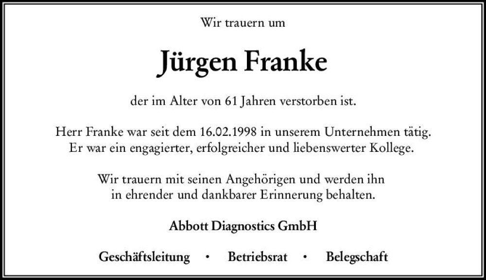 Hier finden Sie alle Traueranzeigen aus der Zeitung, die bisher für Jürgen Franke erschienen sind. Weitere Traueranzeigen, die in der Zeitung erscheinen, werden hier ebenfalls aufgelistet