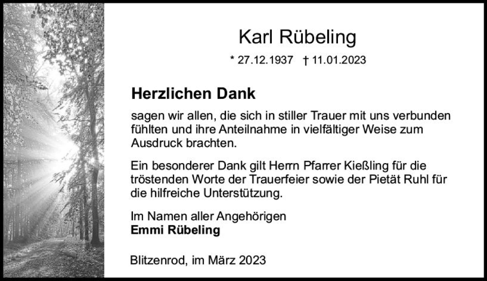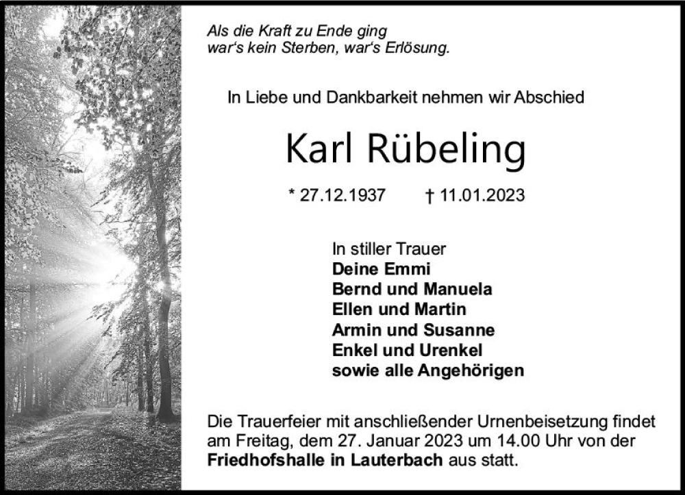 Hier finden Sie alle Traueranzeigen aus der Zeitung, die bisher für Karl Rübeling erschienen sind. Weitere Traueranzeigen, die in der Zeitung erscheinen, werden hier ebenfalls aufgelistet