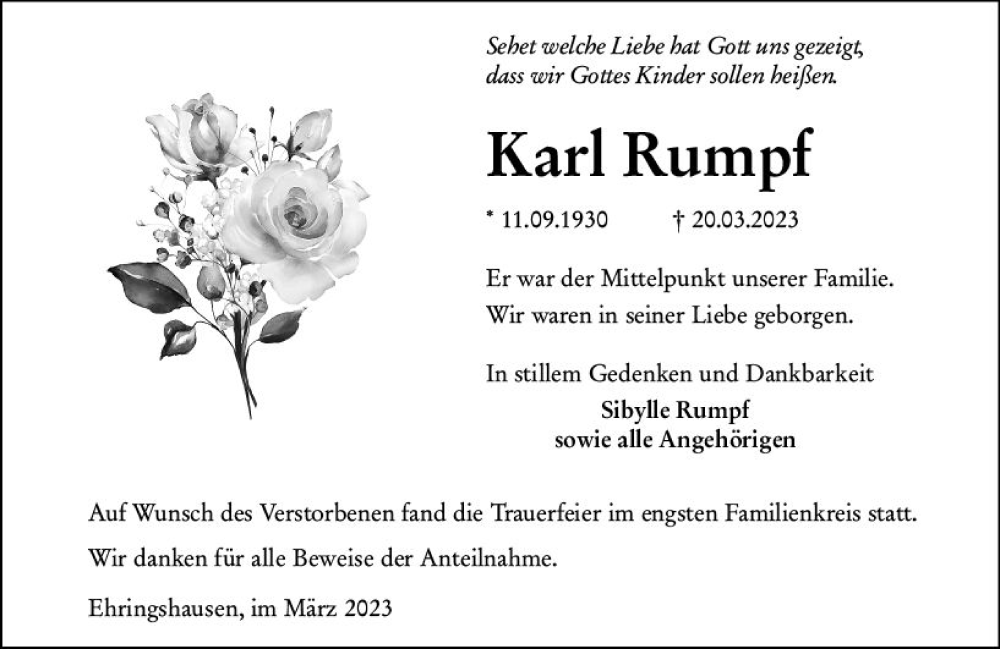 Hier finden Sie alle Traueranzeigen aus der Zeitung, die bisher für Karl Rumpf erschienen sind. Weitere Traueranzeigen, die in der Zeitung erscheinen, werden hier ebenfalls aufgelistet