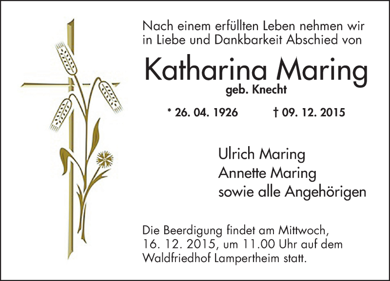 Hier finden Sie alle Traueranzeigen aus der Zeitung, die bisher für Katharina Maring erschienen sind. Weitere Traueranzeigen, die in der Zeitung erscheinen, werden hier ebenfalls aufgelistet