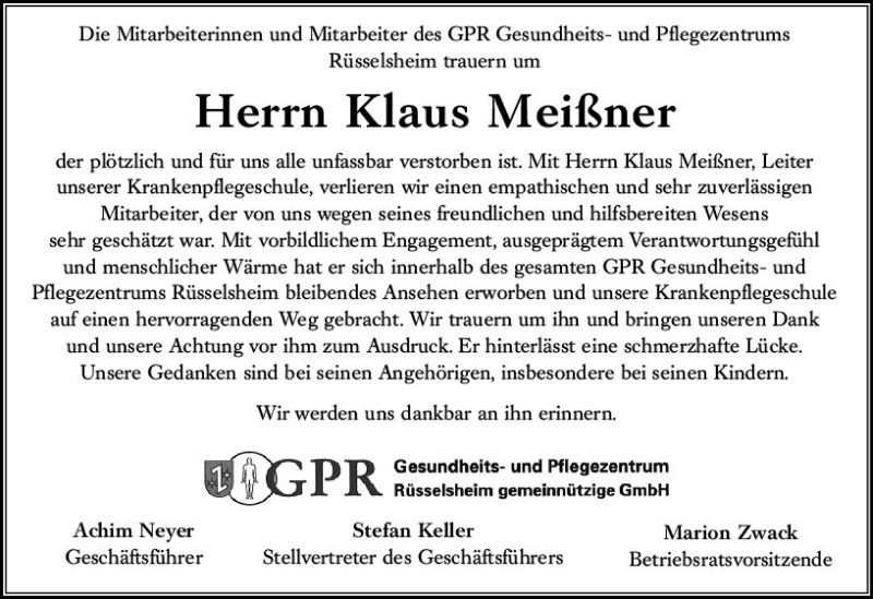 Hier finden Sie alle Traueranzeigen aus der Zeitung, die bisher für Klaus Meißner erschienen sind. Weitere Traueranzeigen, die in der Zeitung erscheinen, werden hier ebenfalls aufgelistet