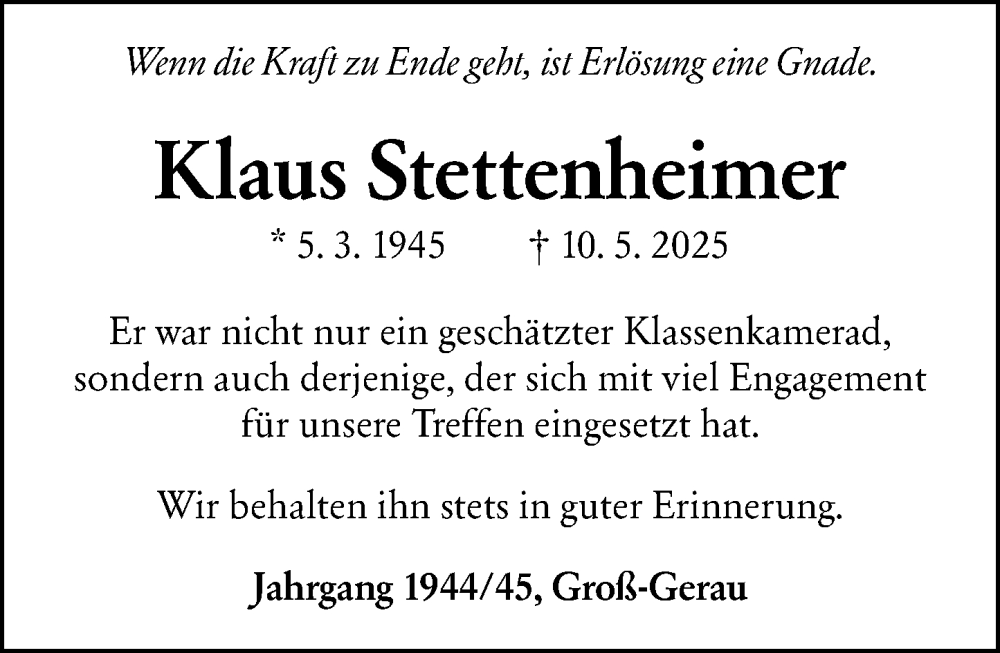 Hier finden Sie alle Traueranzeigen aus der Zeitung, die bisher für Klaus Stettenheimer erschienen sind. Weitere Traueranzeigen, die in der Zeitung erscheinen, werden hier ebenfalls aufgelistet