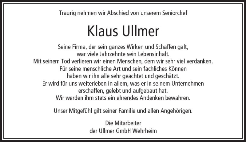 Hier finden Sie alle Traueranzeigen aus der Zeitung, die bisher für Klaus Ullmer erschienen sind. Weitere Traueranzeigen, die in der Zeitung erscheinen, werden hier ebenfalls aufgelistet