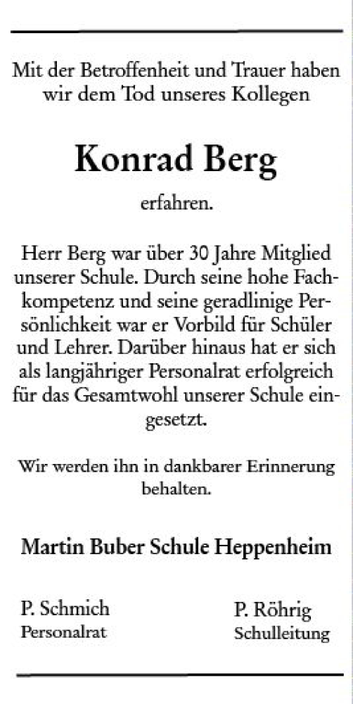 Hier finden Sie alle Traueranzeigen aus der Zeitung, die bisher für Konrad Berg erschienen sind. Weitere Traueranzeigen, die in der Zeitung erscheinen, werden hier ebenfalls aufgelistet