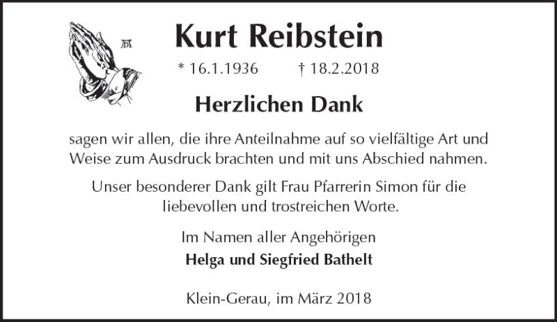Hier finden Sie alle Traueranzeigen aus der Zeitung, die bisher für Kurt Reibstein erschienen sind. Weitere Traueranzeigen, die in der Zeitung erscheinen, werden hier ebenfalls aufgelistet