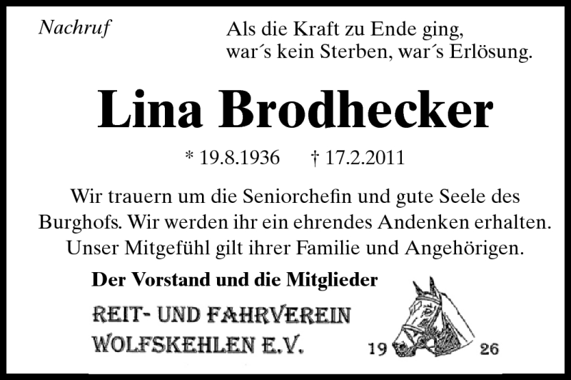 Hier finden Sie alle Traueranzeigen aus der Zeitung, die bisher für Lina Brodhecker erschienen sind. Weitere Traueranzeigen, die in der Zeitung erscheinen, werden hier ebenfalls aufgelistet
