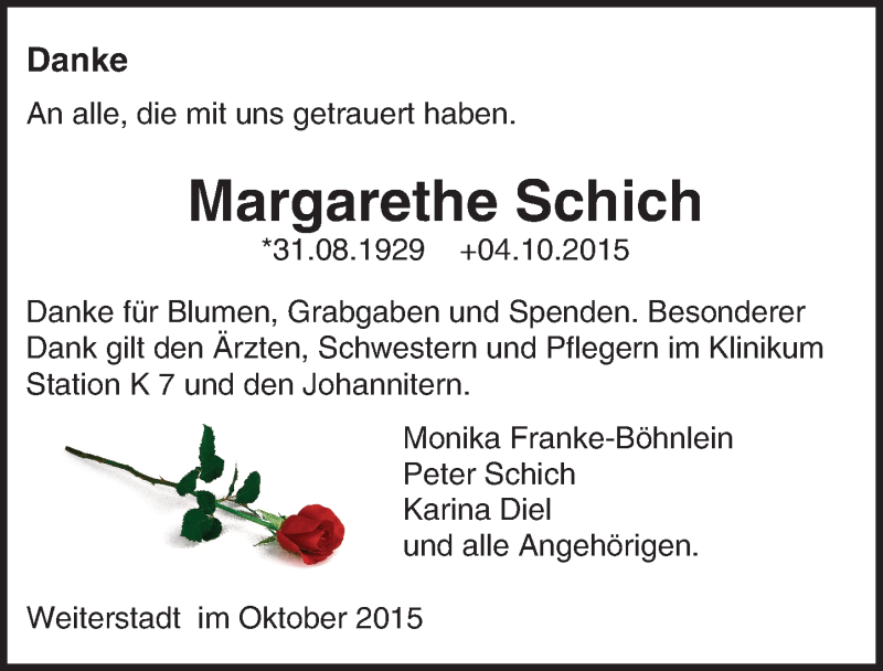 Hier finden Sie alle Traueranzeigen aus der Zeitung, die bisher für Margarethe Schich erschienen sind. Weitere Traueranzeigen, die in der Zeitung erscheinen, werden hier ebenfalls aufgelistet