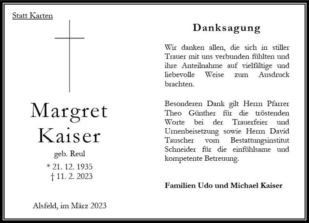 Hier finden Sie alle Traueranzeigen aus der Zeitung, die bisher für Margret Kaiser erschienen sind. Weitere Traueranzeigen, die in der Zeitung erscheinen, werden hier ebenfalls aufgelistet