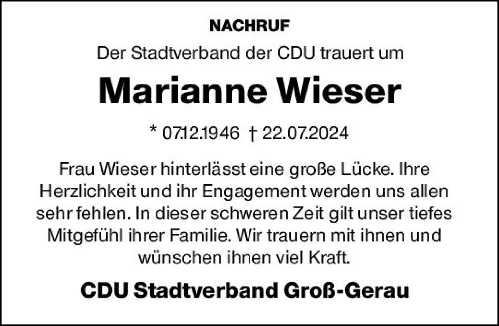 Hier finden Sie alle Traueranzeigen aus der Zeitung, die bisher für Marianne Wieser erschienen sind. Weitere Traueranzeigen, die in der Zeitung erscheinen, werden hier ebenfalls aufgelistet