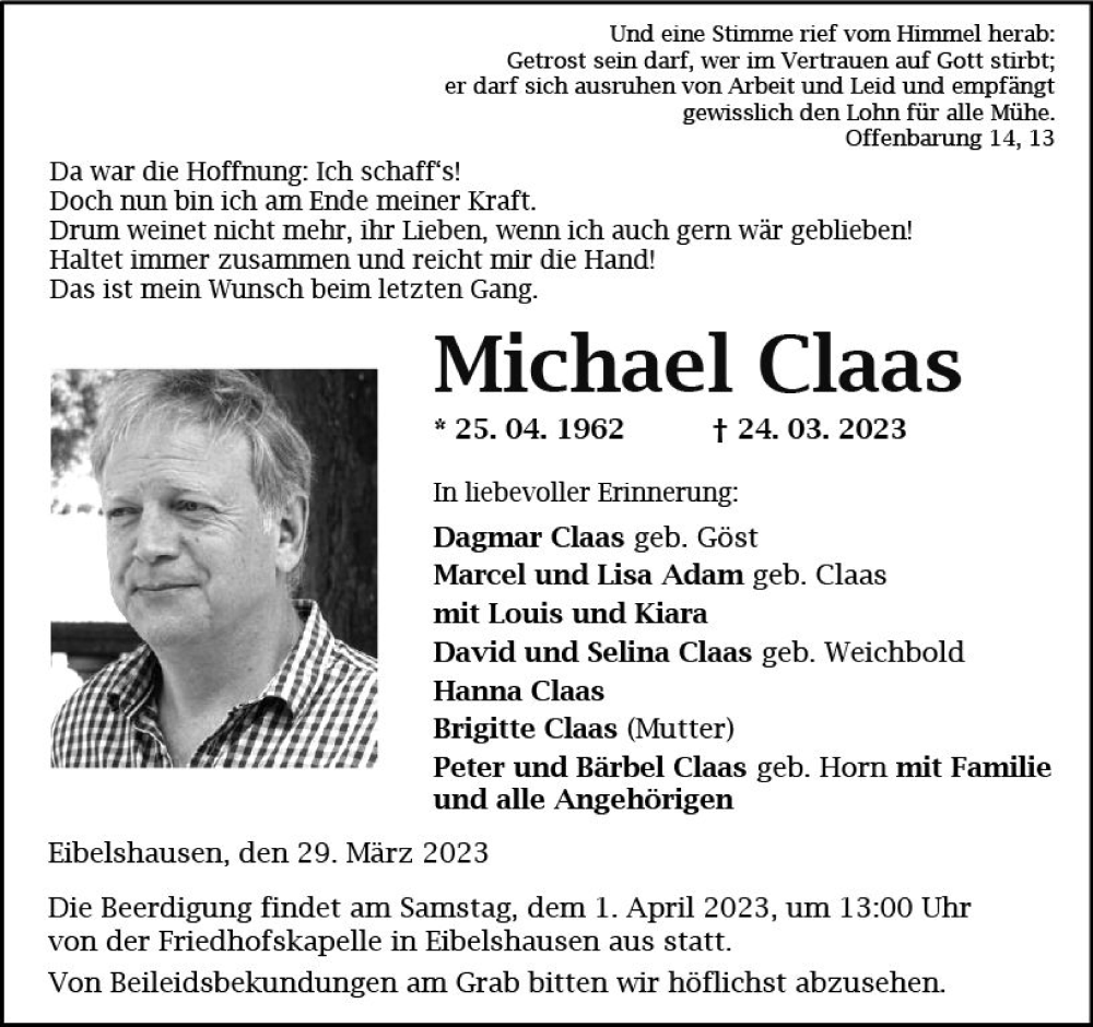 Hier finden Sie alle Traueranzeigen aus der Zeitung, die bisher für Michael Claas erschienen sind. Weitere Traueranzeigen, die in der Zeitung erscheinen, werden hier ebenfalls aufgelistet