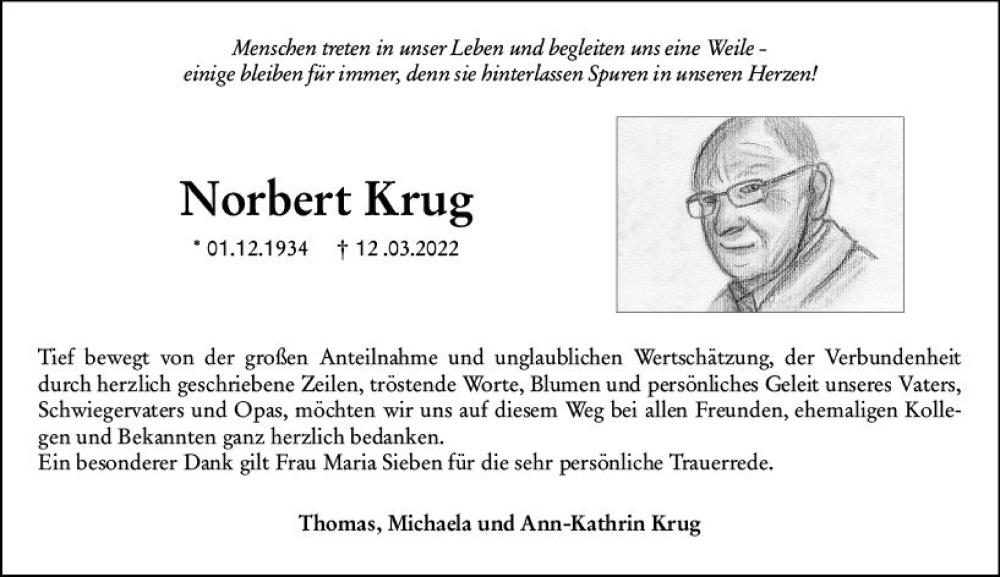 Hier finden Sie alle Traueranzeigen aus der Zeitung, die bisher für Norbert Krug erschienen sind. Weitere Traueranzeigen, die in der Zeitung erscheinen, werden hier ebenfalls aufgelistet