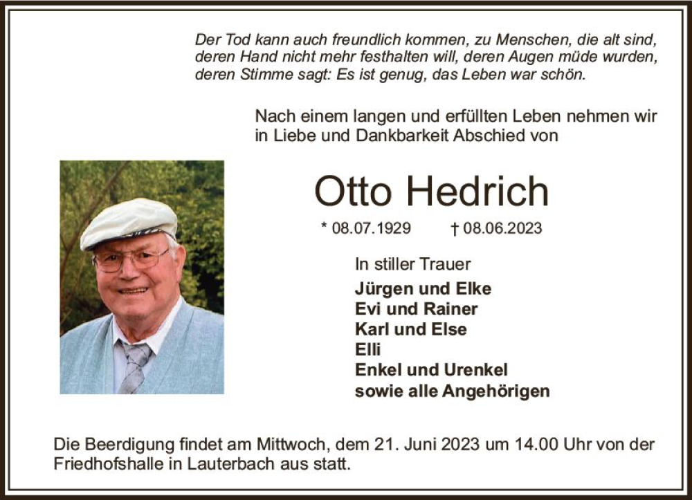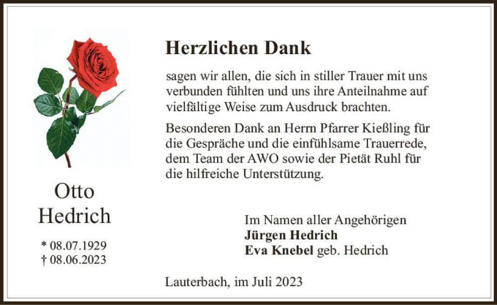 Hier finden Sie alle Traueranzeigen aus der Zeitung, die bisher für Otto Hedrich erschienen sind. Weitere Traueranzeigen, die in der Zeitung erscheinen, werden hier ebenfalls aufgelistet