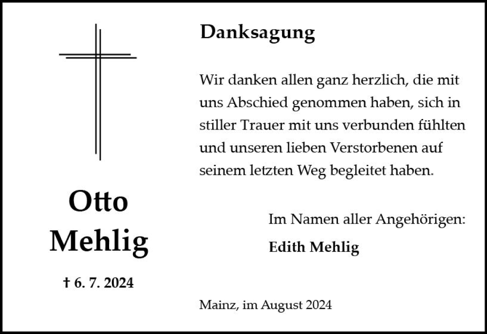 Hier finden Sie alle Traueranzeigen aus der Zeitung, die bisher für Otto Mehlig erschienen sind. Weitere Traueranzeigen, die in der Zeitung erscheinen, werden hier ebenfalls aufgelistet
