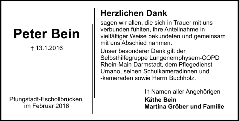 Hier finden Sie alle Traueranzeigen aus der Zeitung, die bisher für Peter Bein erschienen sind. Weitere Traueranzeigen, die in der Zeitung erscheinen, werden hier ebenfalls aufgelistet