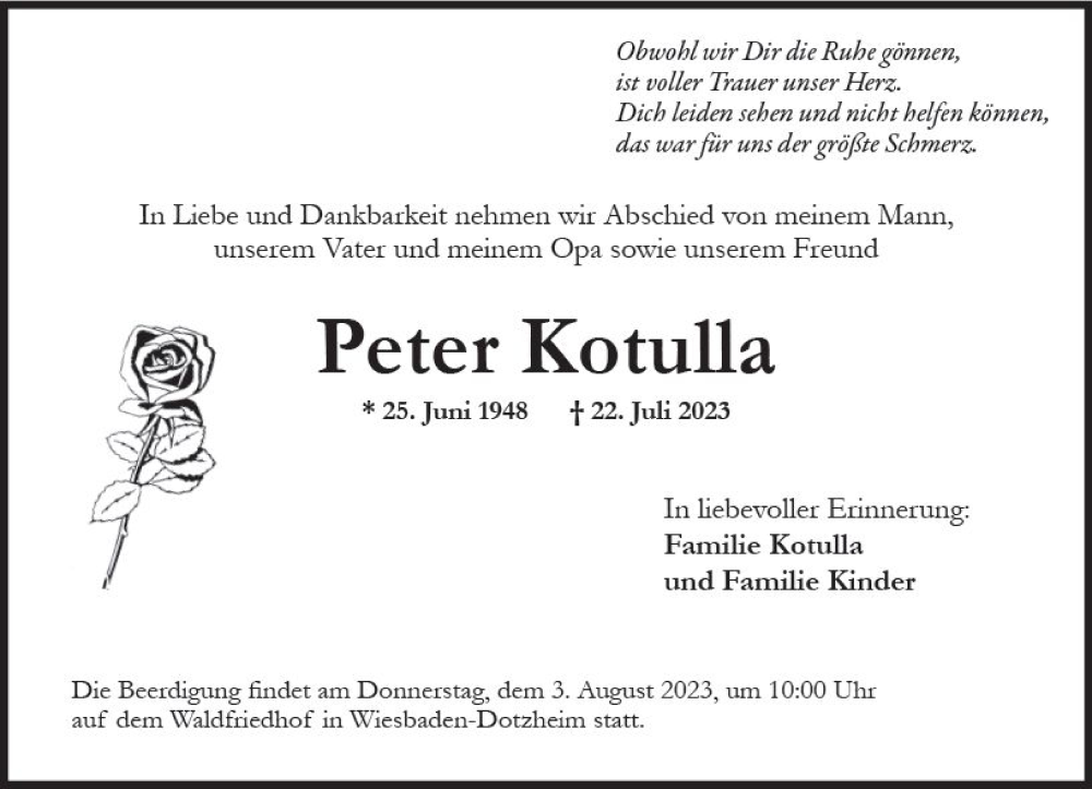 Hier finden Sie alle Traueranzeigen aus der Zeitung, die bisher für Peter Kotulla erschienen sind. Weitere Traueranzeigen, die in der Zeitung erscheinen, werden hier ebenfalls aufgelistet