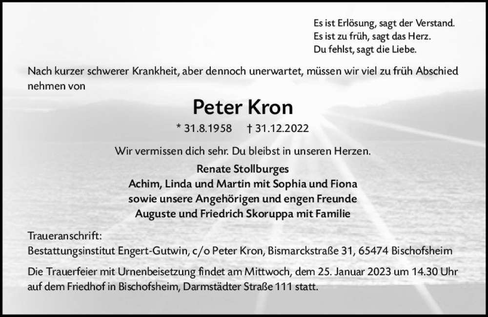 Hier finden Sie alle Traueranzeigen aus der Zeitung, die bisher für Peter Kron erschienen sind. Weitere Traueranzeigen, die in der Zeitung erscheinen, werden hier ebenfalls aufgelistet