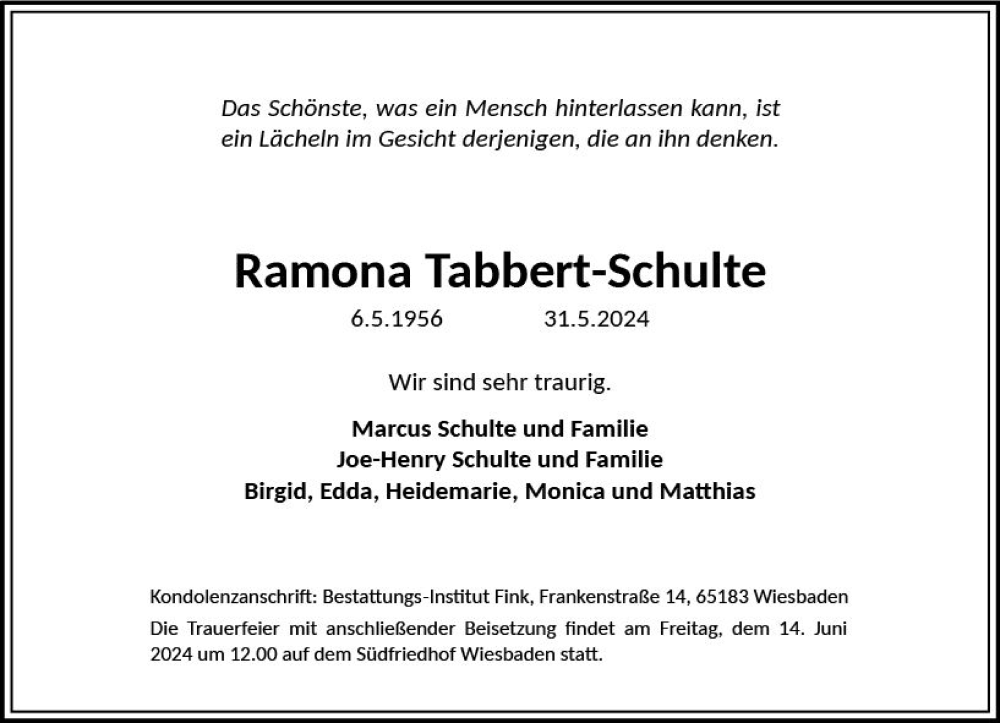 Hier finden Sie alle Traueranzeigen aus der Zeitung, die bisher für Ramona Tabbert-Schulte erschienen sind. Weitere Traueranzeigen, die in der Zeitung erscheinen, werden hier ebenfalls aufgelistet