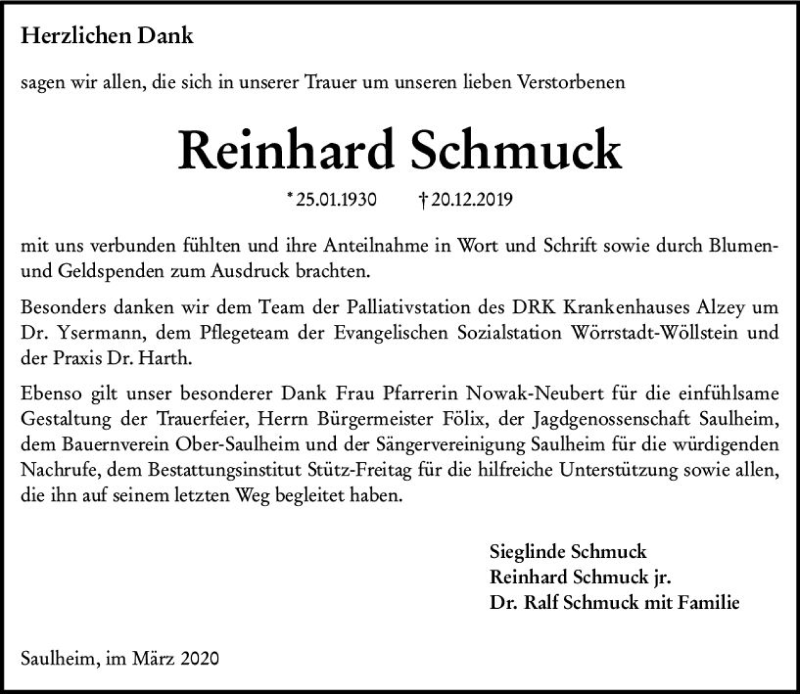 Hier finden Sie alle Traueranzeigen aus der Zeitung, die bisher für Reinhard Schmuck erschienen sind. Weitere Traueranzeigen, die in der Zeitung erscheinen, werden hier ebenfalls aufgelistet