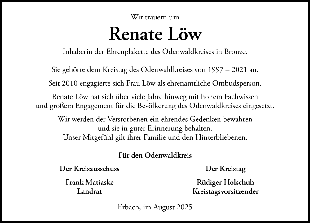 Hier finden Sie alle Traueranzeigen aus der Zeitung, die bisher für Renate Löw erschienen sind. Weitere Traueranzeigen, die in der Zeitung erscheinen, werden hier ebenfalls aufgelistet