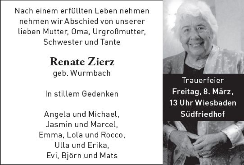 Hier finden Sie alle Traueranzeigen aus der Zeitung, die bisher für Renate Zierz erschienen sind. Weitere Traueranzeigen, die in der Zeitung erscheinen, werden hier ebenfalls aufgelistet