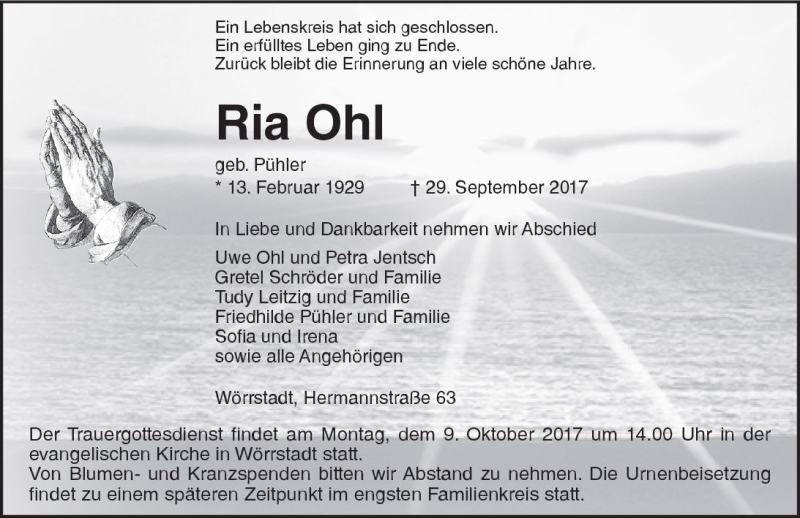 Hier finden Sie alle Traueranzeigen aus der Zeitung, die bisher für Ria Ohl erschienen sind. Weitere Traueranzeigen, die in der Zeitung erscheinen, werden hier ebenfalls aufgelistet