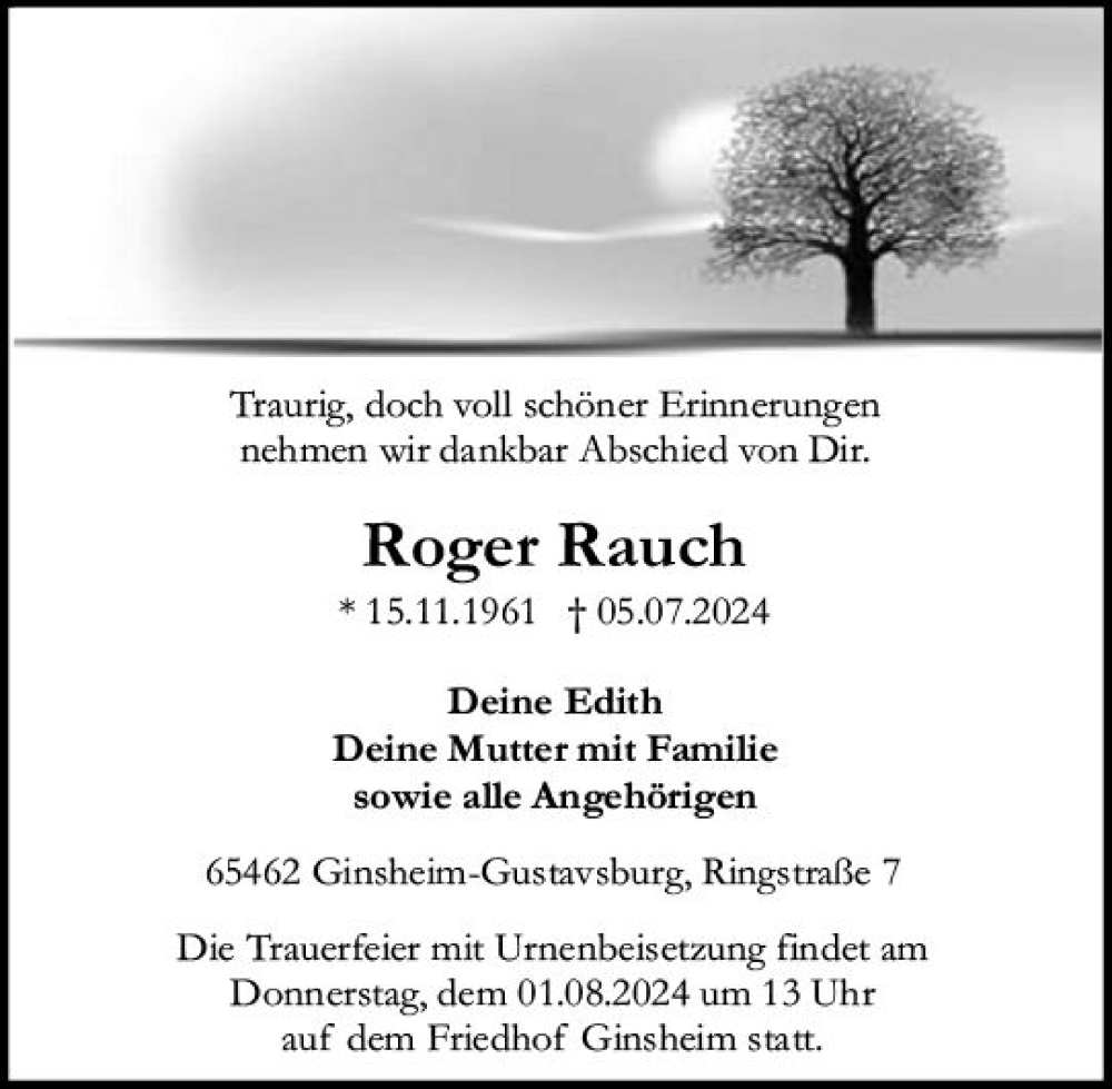 Hier finden Sie alle Traueranzeigen aus der Zeitung, die bisher für Roger Rauch erschienen sind. Weitere Traueranzeigen, die in der Zeitung erscheinen, werden hier ebenfalls aufgelistet