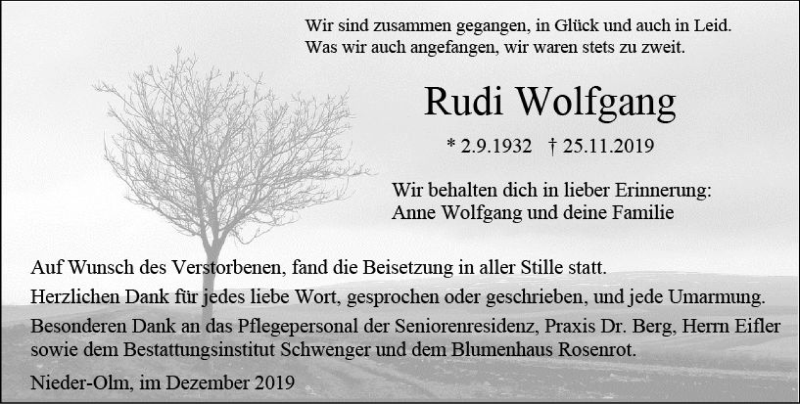 Hier finden Sie alle Traueranzeigen aus der Zeitung, die bisher für Rudi Wolfgang erschienen sind. Weitere Traueranzeigen, die in der Zeitung erscheinen, werden hier ebenfalls aufgelistet