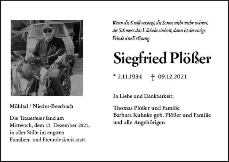 Hier finden Sie alle Traueranzeigen aus der Zeitung, die bisher für Siegfried Plößer erschienen sind. Weitere Traueranzeigen, die in der Zeitung erscheinen, werden hier ebenfalls aufgelistet